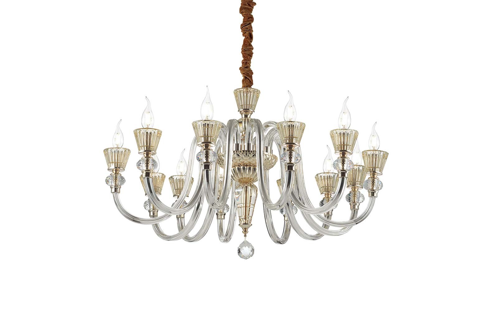 A traditional design chandelier, the glamorous floral-shaped centerpiece is completed with clear glass arms and twinkling decorative elements, suspended from an aristocratically draped canopy, the flame-like bulbs rendering a warm glow.