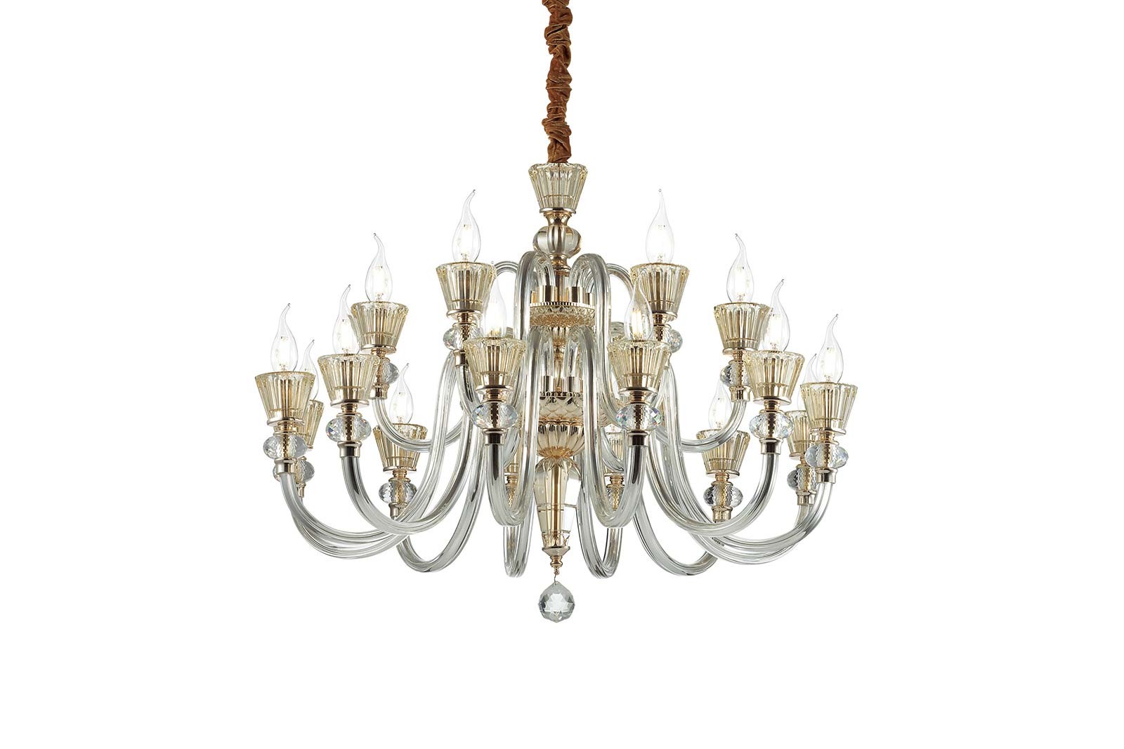 A traditional design chandelier, the glamorous floral-shaped centerpiece is completed with clear glass arms and twinkling decorative elements, suspended from an aristocratically draped canopy, the flame-like bulbs rendering a warm glow.