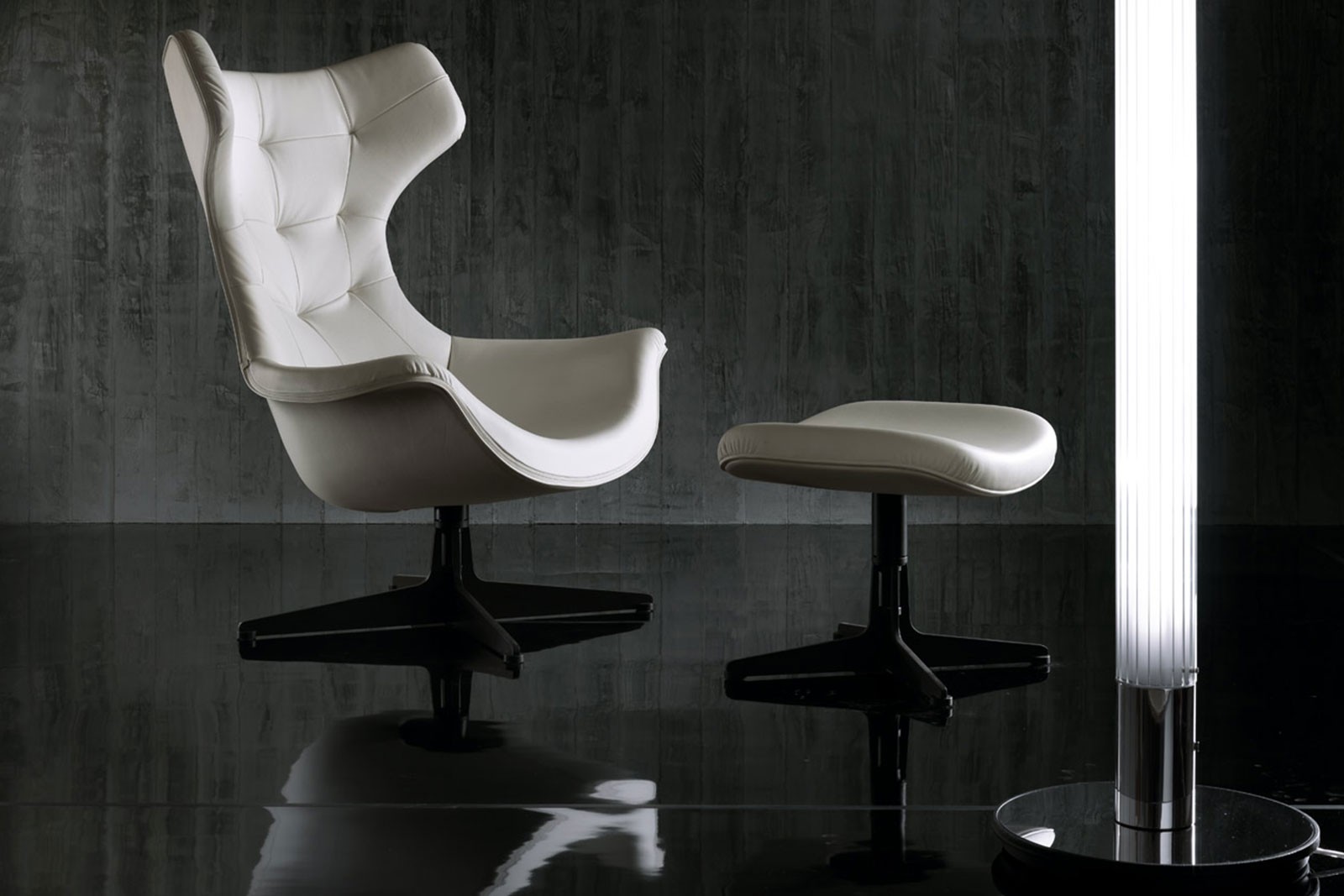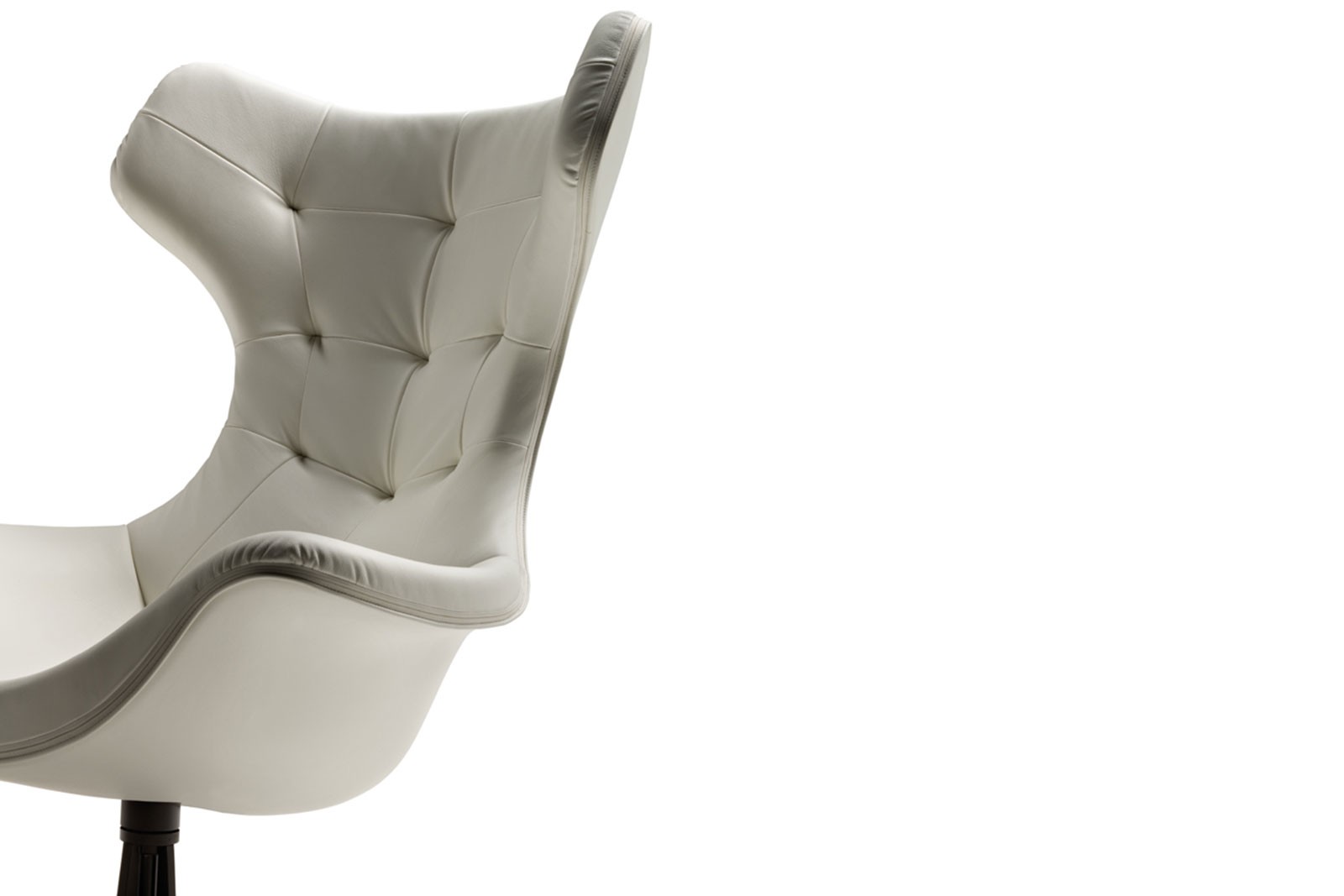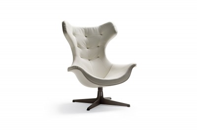 An ultra-contemporary interpretation of the classic bergere, Regina II is a swivel armchair. The seat and the backrest with the capitonne effect workmanship enliven the surface, creating a delicate play of spaces and solids. Regina II comes with an elegant pouf.
