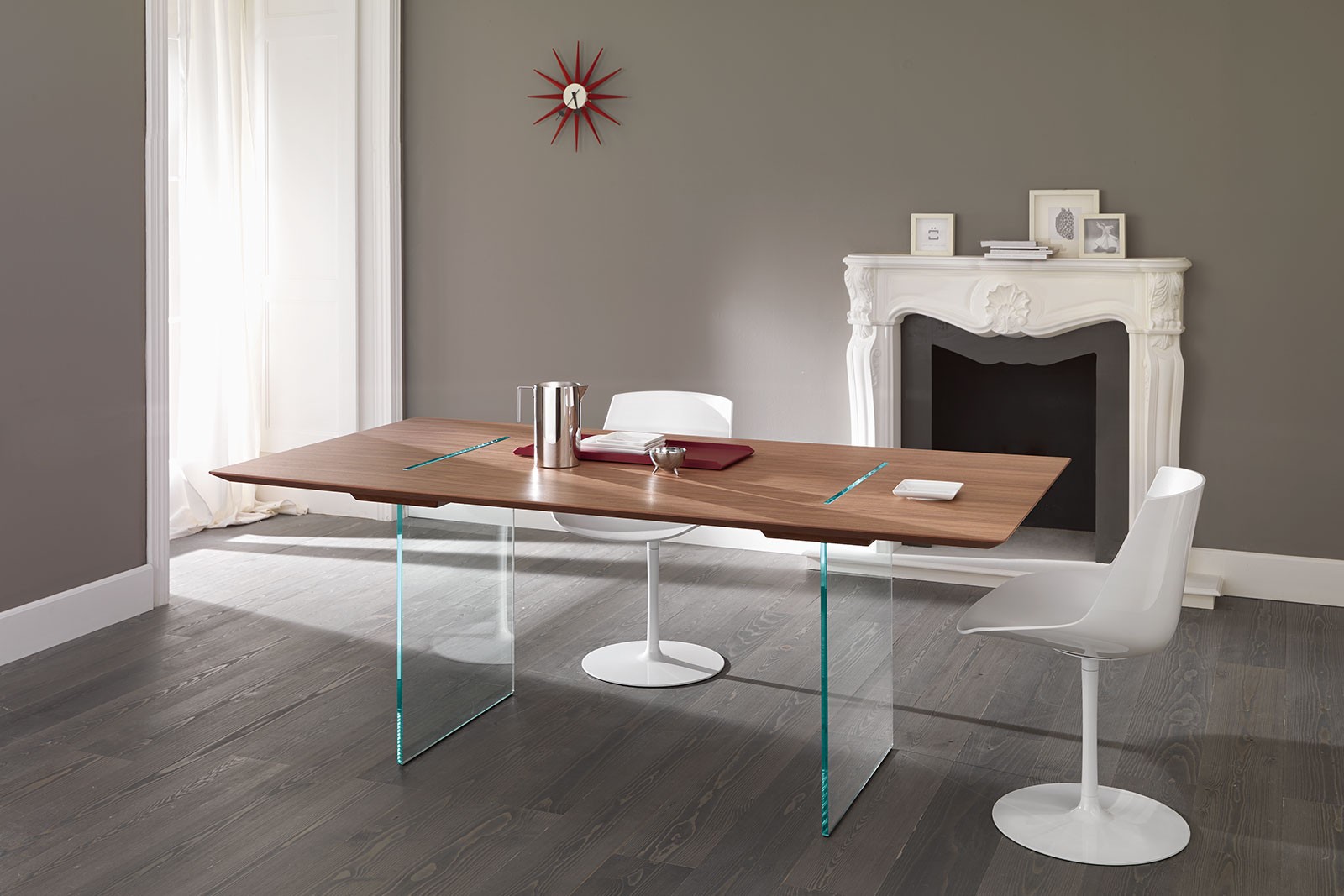 Magically suspended the top, sustained and crossed by two vertical panels makes a contemporary and unique design for a dining table.