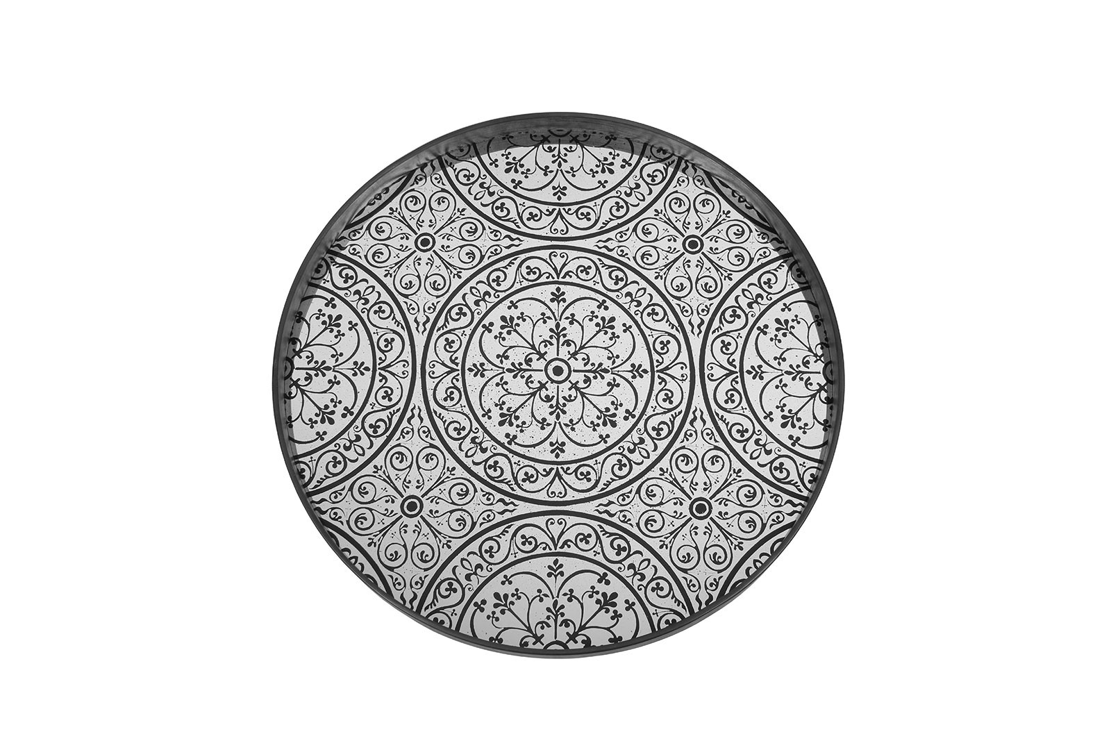The Moroccan Tray features a sophisticated pattern in neutral tones that adds a touch of global chic to any room. Its mirrored surface also helps to brighten the room. Each piece is created by hand and one-of-a-kind.