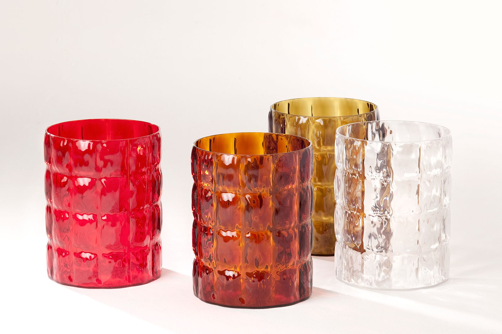 A colourful and playful round container-vase, ideal for any room in the home. The distinctive feature and special allure of these original vases lie in their particular conformation, suggestive of a wafed fabric with irregular sinuosities caused by the different surface thicknesses.
