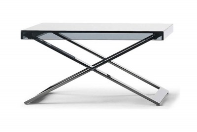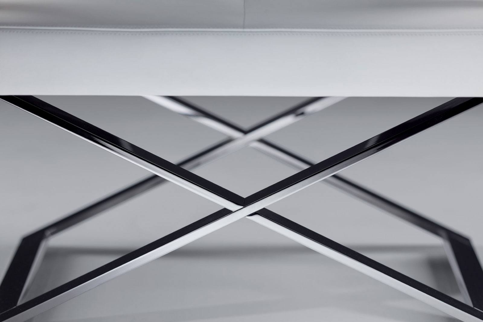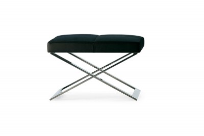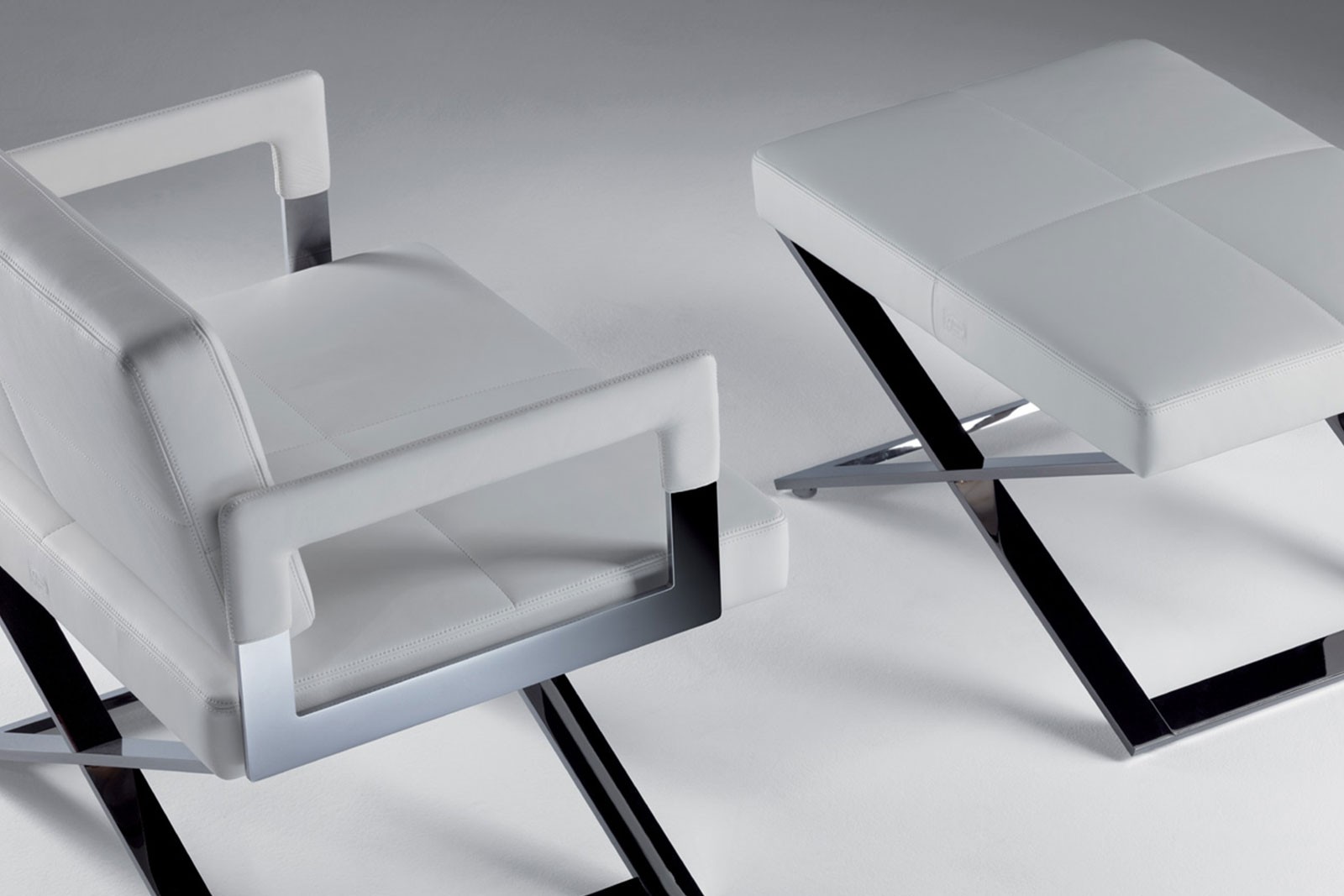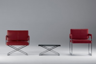 A re-interpretation of the classic director’s chair. A clear-cut, linear crossover frame forms an X which supports the seat, the pouf and the small table.