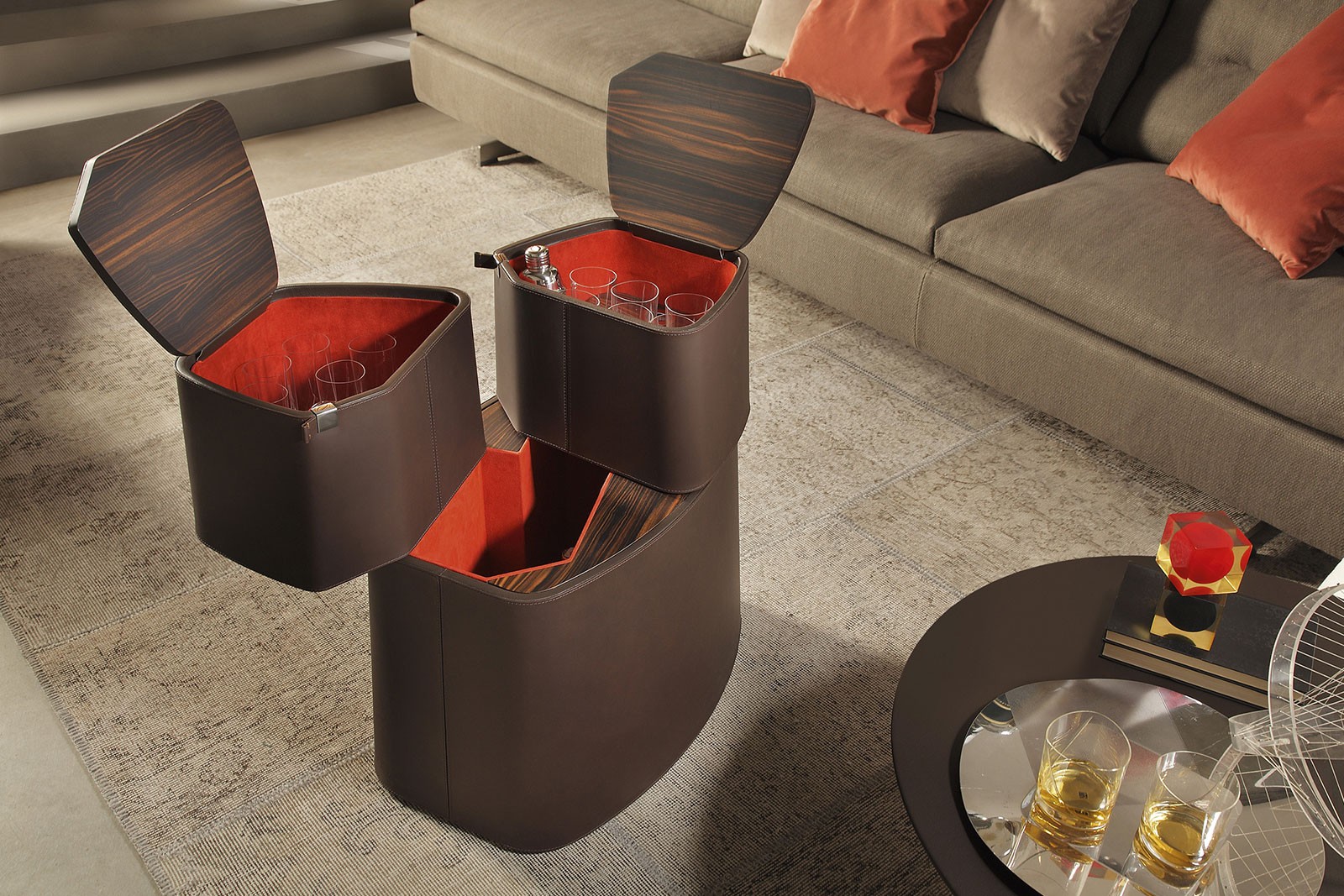 Babel is a compact, attractive and intriguing home bar unit comprising three cupboards in two different sizes. The ...