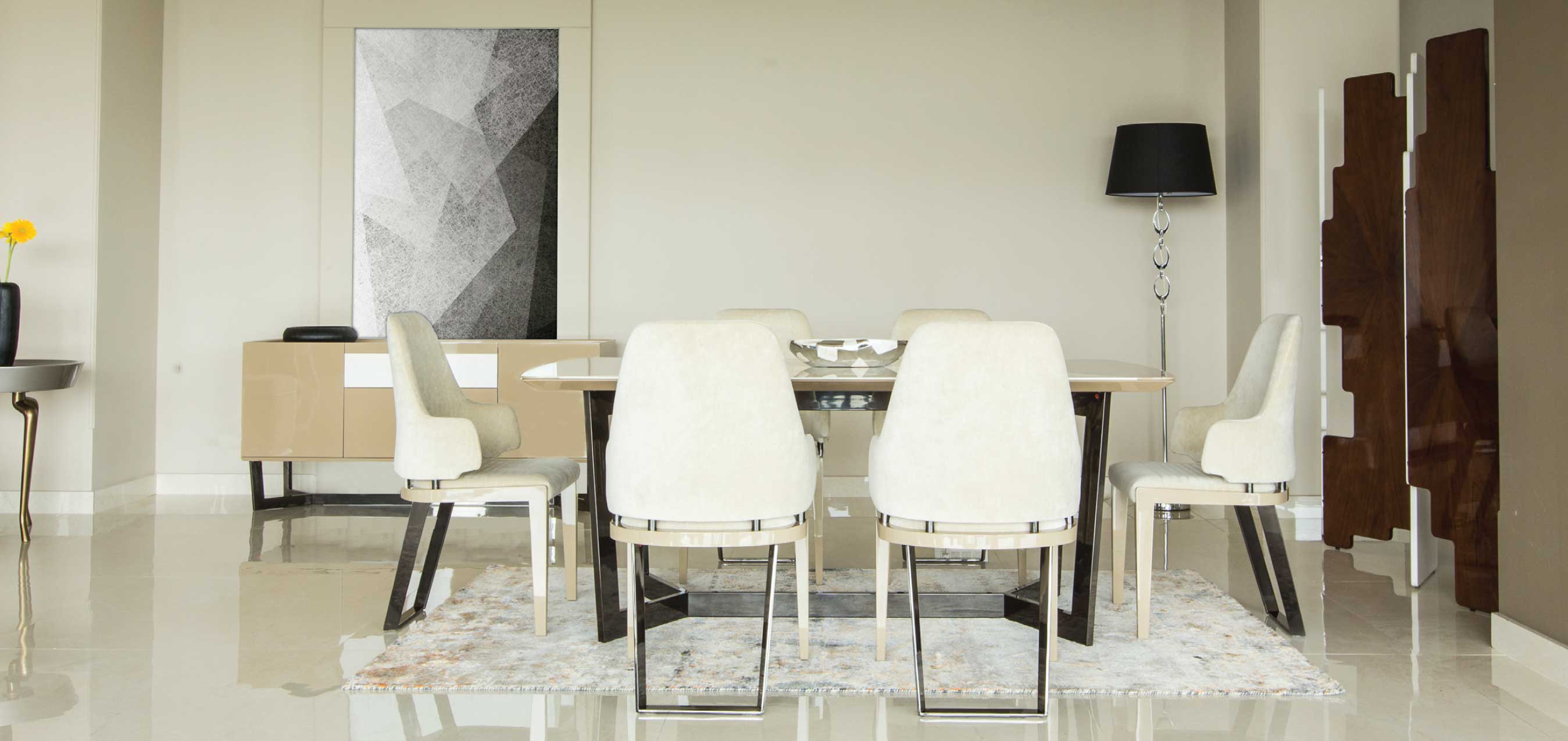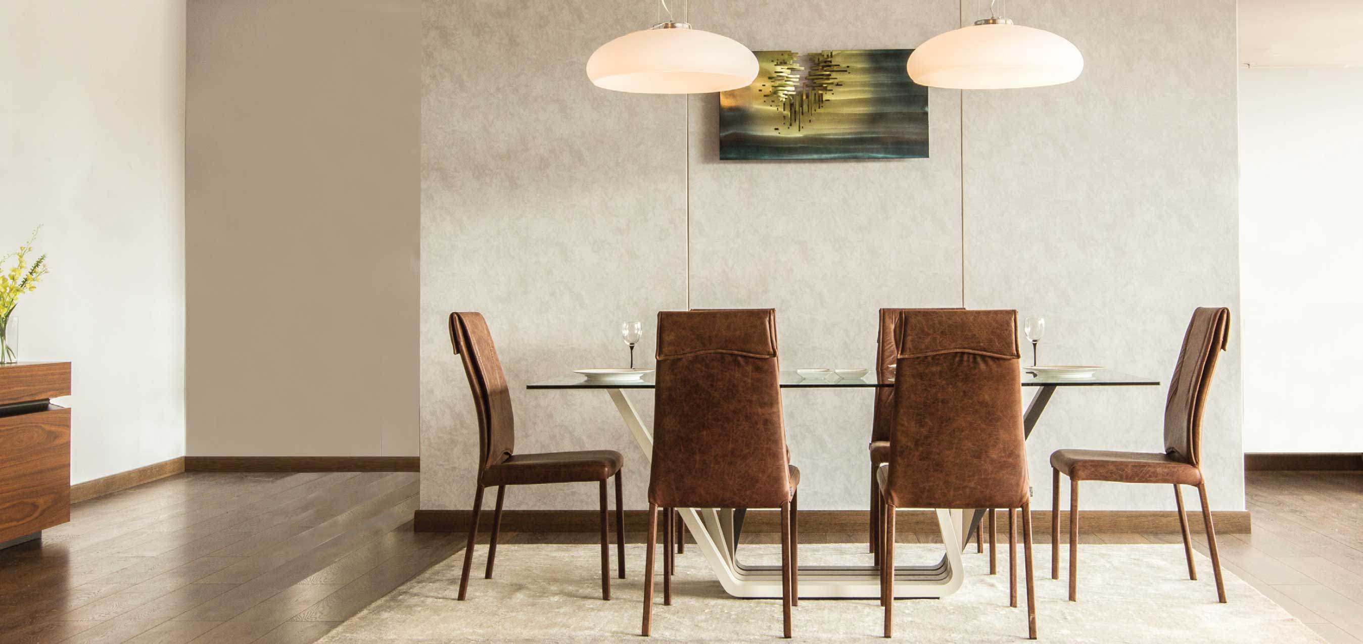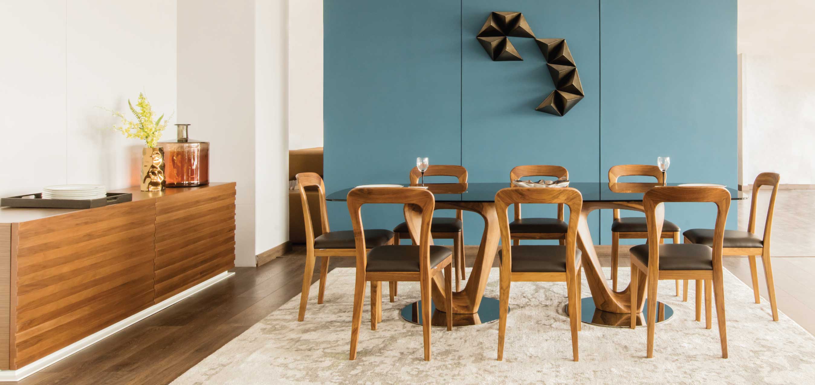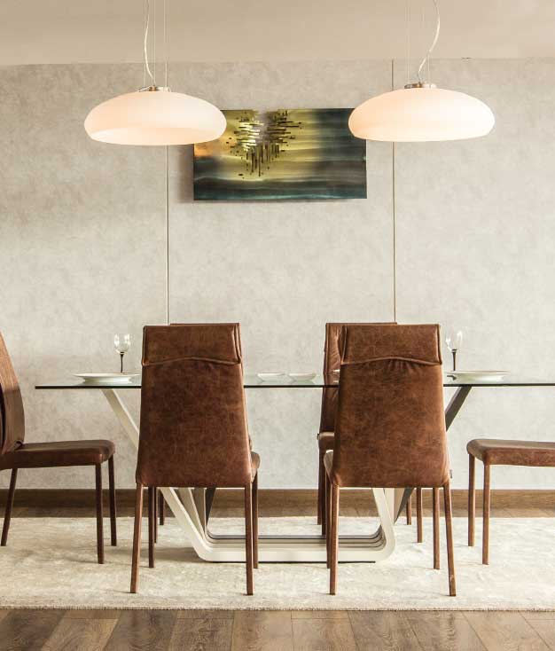 Solidity and lightness. This dining setting is a perfect ensemble of interesting contrasts- sideboard in wood with its warm tonality expressing solidity as against the table on delicate supports, topped with glass expressing lightness.