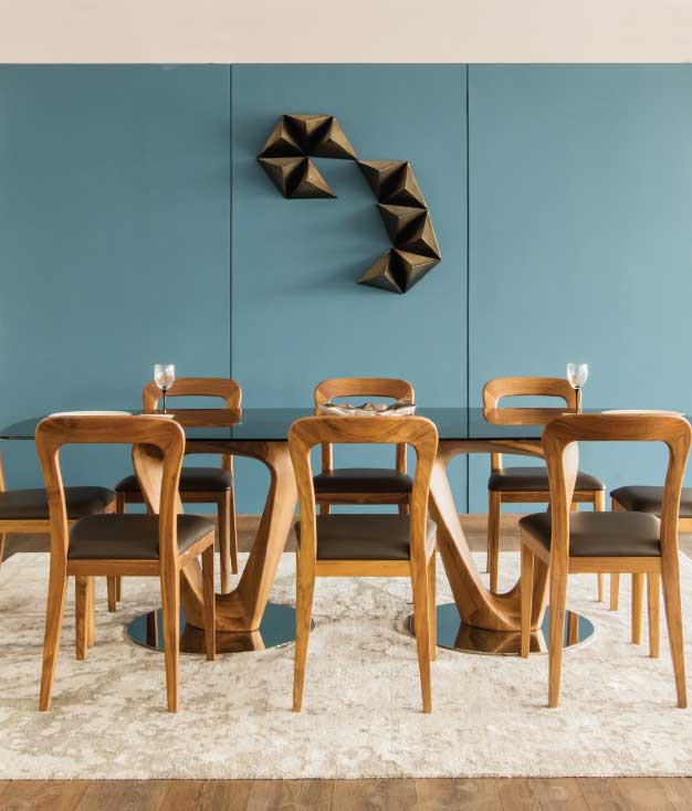 Articulated in wood and designed to give a contemporary expression, this eight seater dining table from Pacini & Cappellini creates a high level of aesthetical appeal against a blue background.